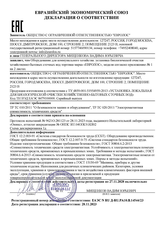Компания ООО «Ледерон» является официальным представителем производителя очистных сооружений Евролос, что подтверждается выданным нам сертификатом дилерства.